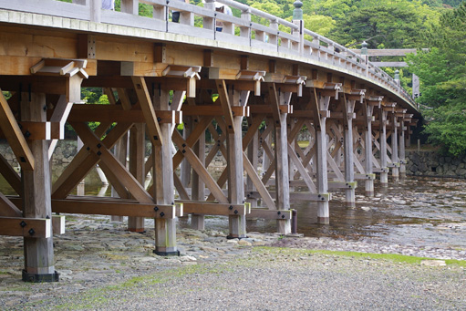 内宮も外宮も、いまから25年ほど前に、妻子とともに訪れたことがあったが、その折の記憶は殆ど消失している。かろうじて、宇治橋を渡ったことと、門前の路地で赤福餅を食ったことばかり覚えていた。その宇治橋は昨年立て替えられたばかりといい、まだ新しかった。この橋を、境内の方から見上げるといい眺めだとガイドに言われて、帰り際に右手の橋詰から橋の骨格を見上げた。なかなか絵になる眺めだ。