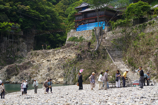 ややして、和歌山、三重、奈良三県の県境という地点に差し掛かった。そこに小さな砂洲があって、船から降りて渓谷美を身近に堪能できるようになっている。我々はそこに降りて記念撮影をした。汀にはカヤックが二艘浮かんでいる。また砂洲の上の断崖には古ぼけた木造の旅館が立っていて、いまにも渓谷に向かって崩れ落ちてきそうな頼りなさを感じさせる。