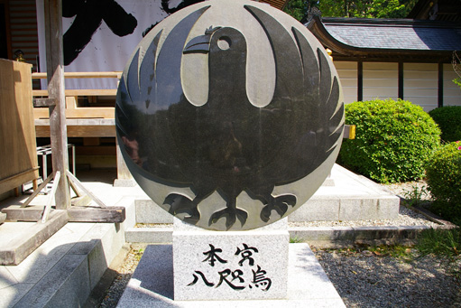 その八咫烏だが、古事記には、八咫烏を神武天皇の前に遣わして、熊野から吉野へと先導させたのは高皇産霊尊ということになっている。三本足のイメージで表されることが多い。この神社でも、三本足の烏をあしらった大きな旗が鳥居の横にたなびいていたほか、本殿の脇にも大きな石碑がたっていた(上の写真)