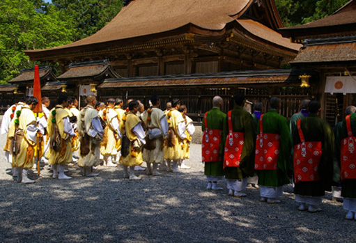 傍らの説明書きには、拝殿の屋根の修復が無事終了したとあるから、この神事はそれを祝ってのことかもしれない。神事自体は至って簡素なもので、それが終わると、修験者が法螺貝を吹き鳴らしながら、石段を下りていった。