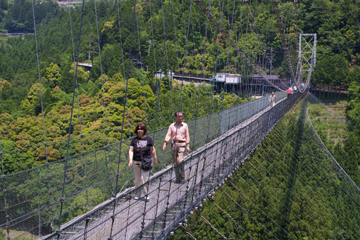 熊野本宮を辞して後、十津川の渓谷を遡り、谷瀬と言うところに至った。深い谷を跨ぐようにして大きな吊橋が架かっている。高さ50メートル、長さ297メートルといい、いまでも地元の生活用に使われているという。つまり村道だ。